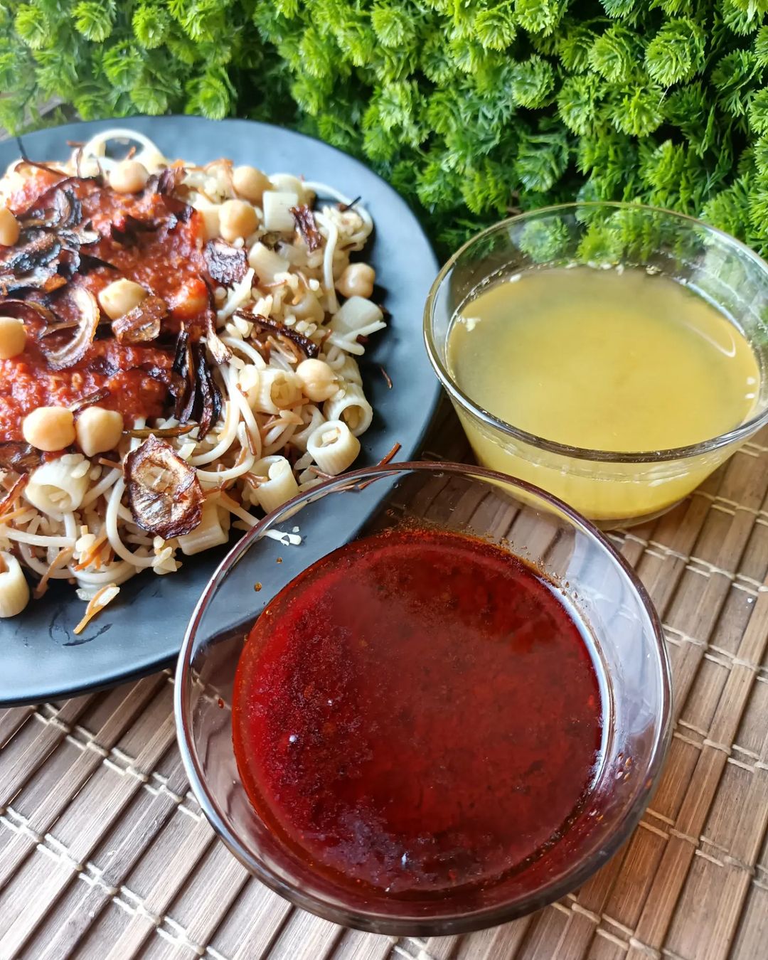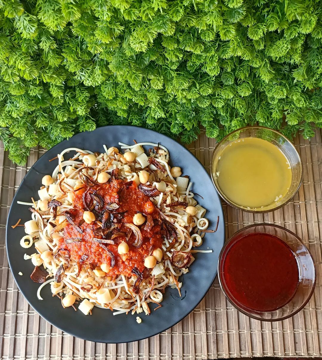 Before writing this, I had lived under the impression that Koshary was a meal for the Egyptian laborers who simply got bored of the food they had. In essence, while colorful, Koshary looks like some leftover meals mixed together. That’s at least how I described it to everyone who was trying it for the first time. A mixture of rice, macaroni, lentils, roasted or fried onions, chickpeas, and most importantly, a healthy—or unhealthy—amount of spice and tomato sauce.